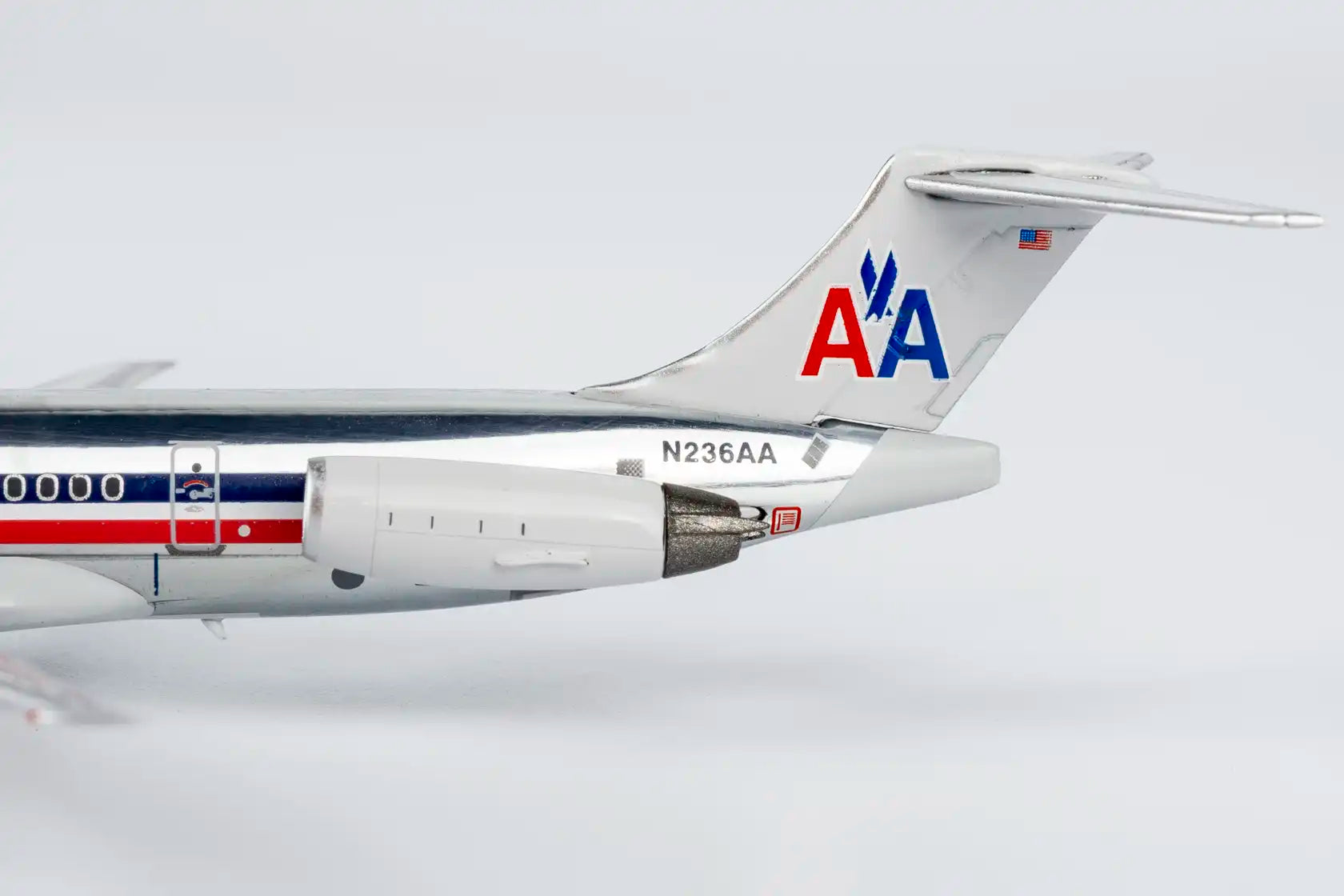 The American Airlines McDonnell Douglas MD-82 with registration N236AA features a distinctive black nosecone, setting it apart visually from standard liveries. This particular MD-82 model was released by NG Models in June 2025 as a high-quality 1:400 scale diecast collectible, highly regarded for its detailed accuracy including precise decals, antennas, engines, and landing gear.